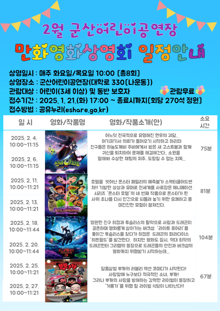 | 386 | 2025년 2월 군산어린이공연장 어린이 만화영화 상영 안내 |