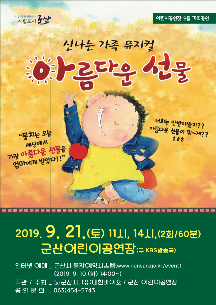 군산 어린이공연장에서는 오는 9월 21일 재미와 감동이 있는 가족뮤지컬을 다음과 같이 개최하오니 많은 참석 바랍니다.