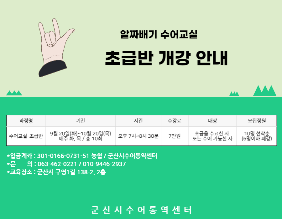 | 160 | 2022년 군산시수어통역센터 <수어교실 초급반> 수강생 모집 |