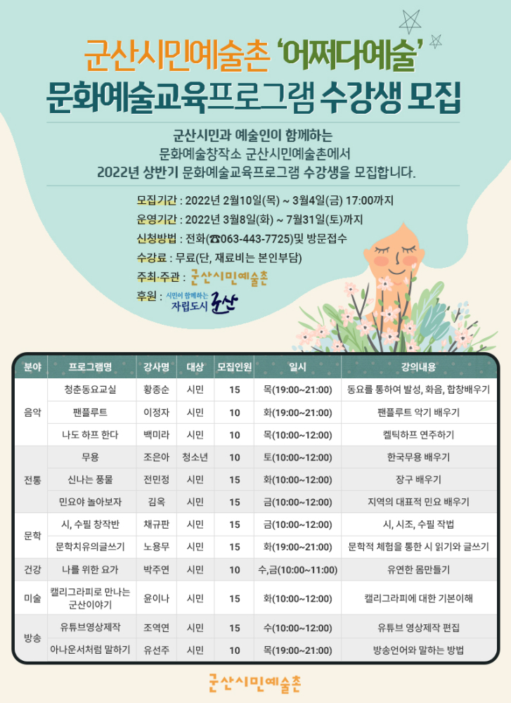 | 135 | 2022년 군산시평생학습관 온택트 평생학습 1기 프로그램 수강생 모집 |