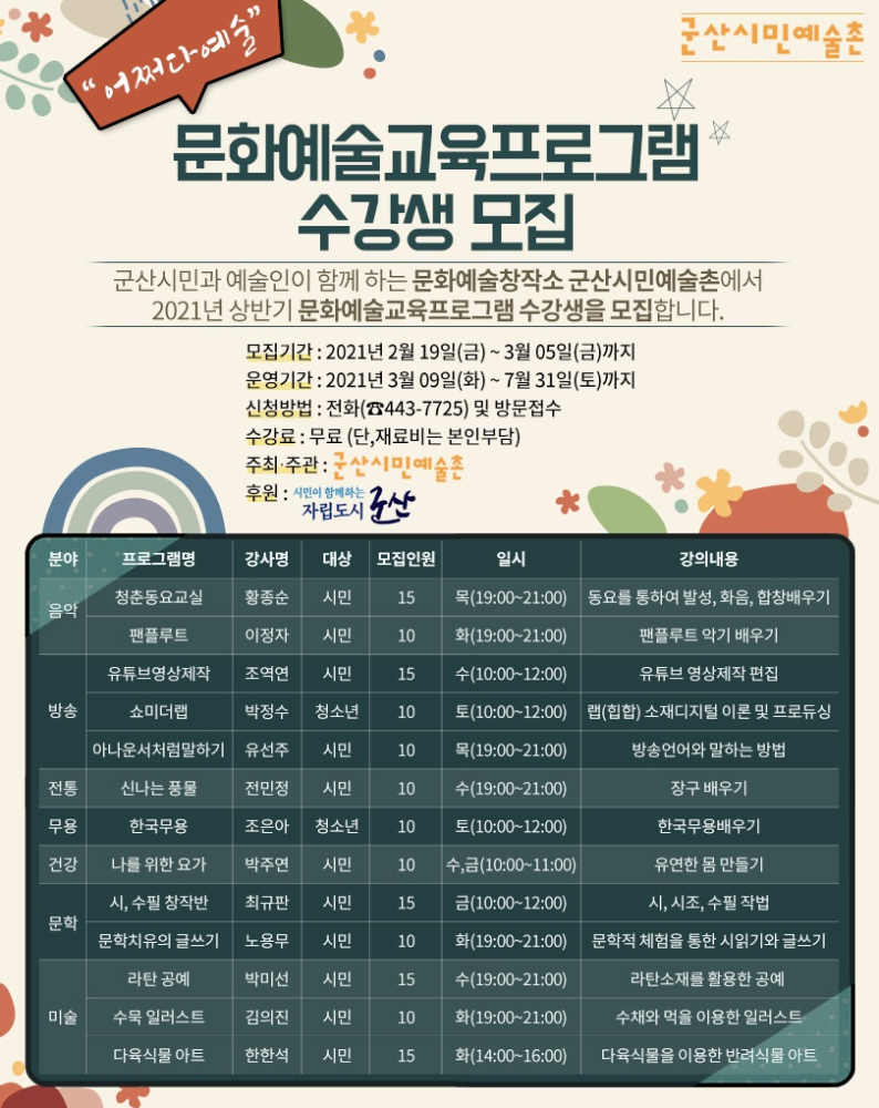 | 110 | 2021년 군산시평생학습관 정규 1기 프로그램 수강생 모집 |