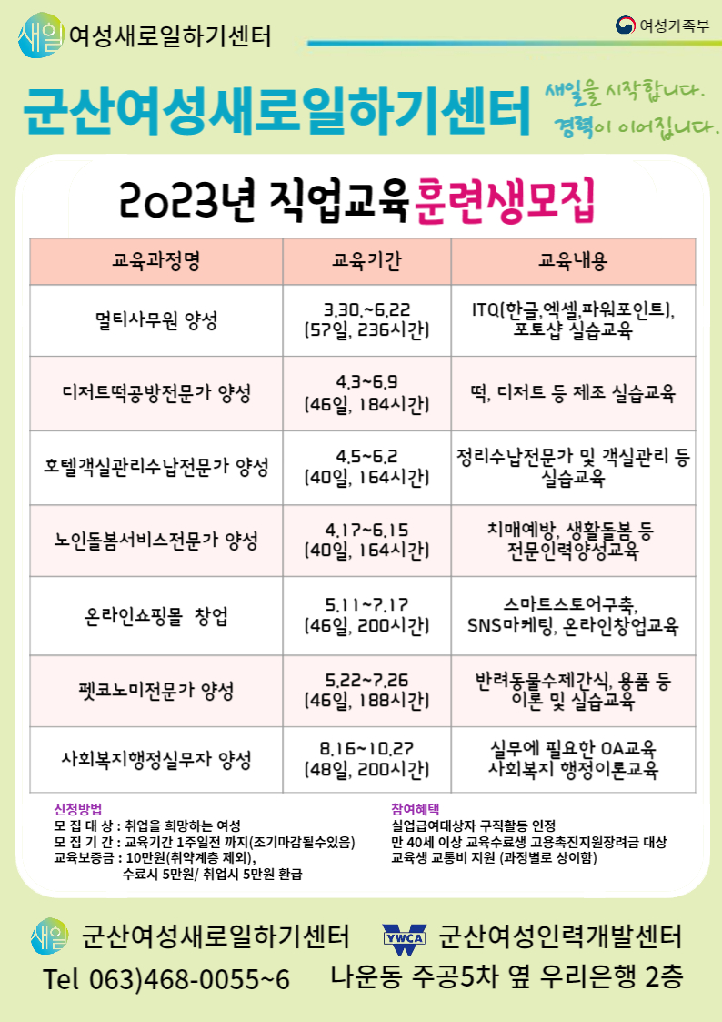 □교육문의 : 군산여성인력개발센터 (☎063-468-0055, 홈페이지: http://www.kswork.or.kr)