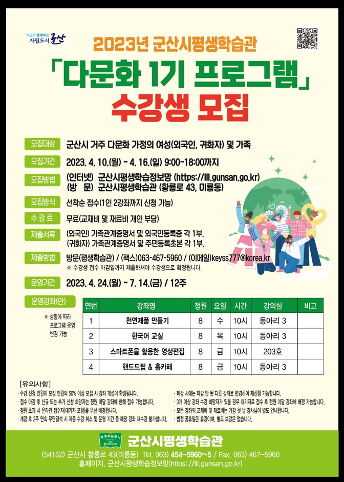 2023 군산시평생학습관 다문화 1기 수강생을 다음과 같이 모집하오니