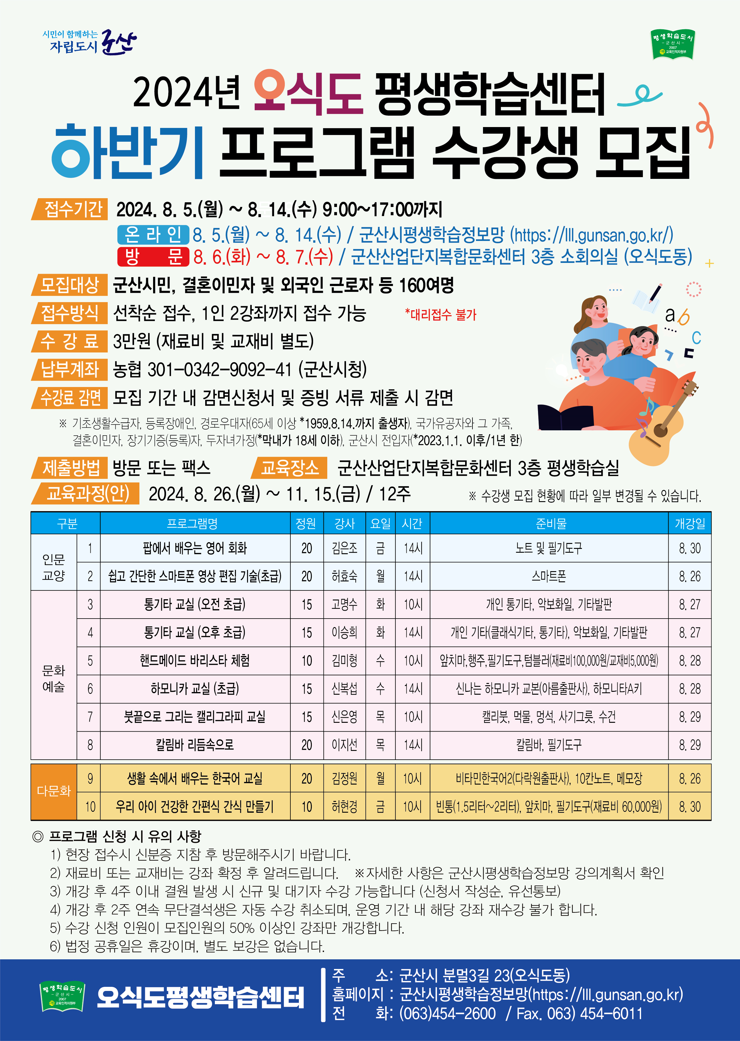 기타 자세한 사항은 <2024년 오식도 평생학습센터 하반기 프로그램 수강생 공고문>을 참고하시기 바랍니다.