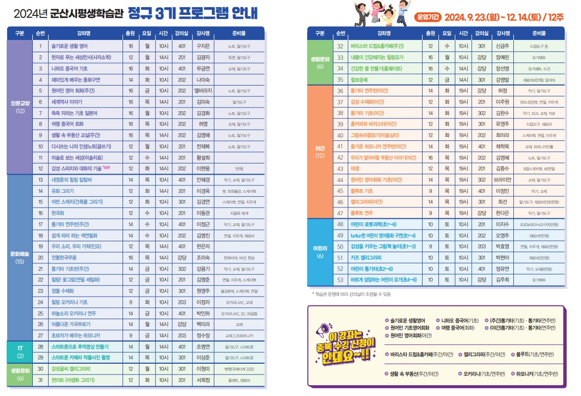 2024년 군산시평생학습관 정규 3기 프로그램 수강생 모집