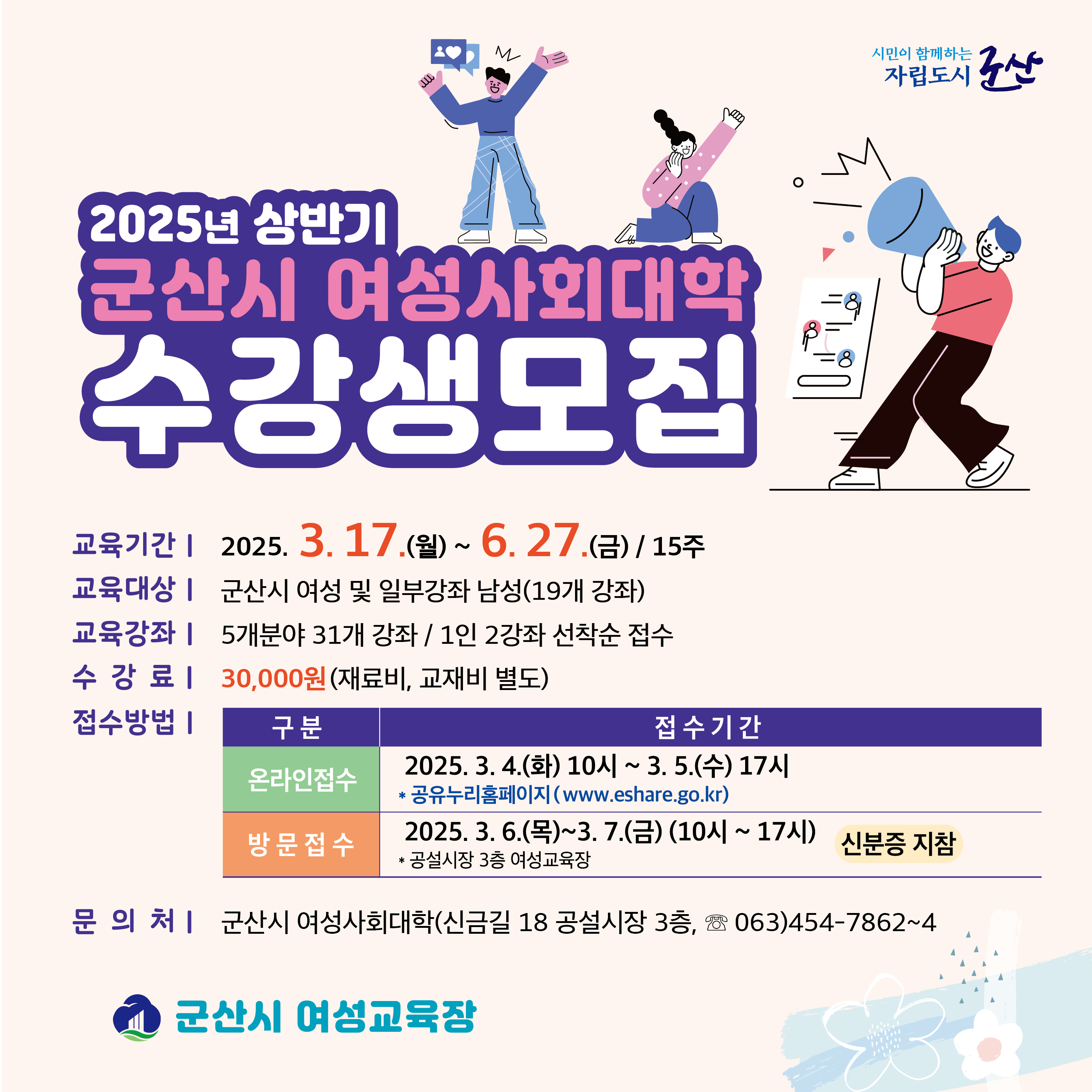 - 방 문 접 수 : 2025. 3. 6.(목) ~ 3. 7.(금) (10시 ~ 17시) / 접수처: 여성교육장(군산시 신금길 18, 공설시장 3층)