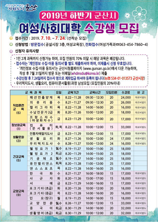 2019년 하반기 여성사회대학 수강생을 아래와 같이 모집하오니 많은 참여 바랍니다.
