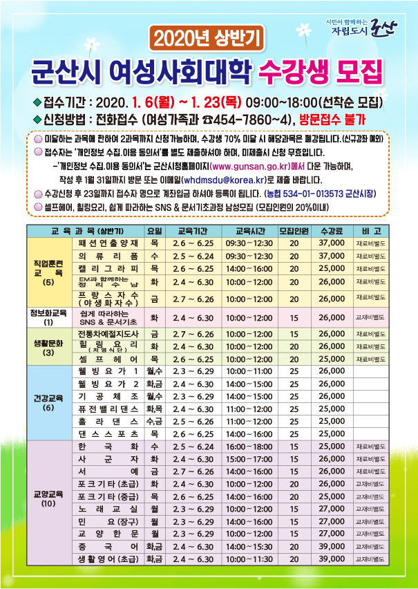 2020년 상반기 군산시 여성사회대학의 수강생을 아래와 같이 모집합니다.