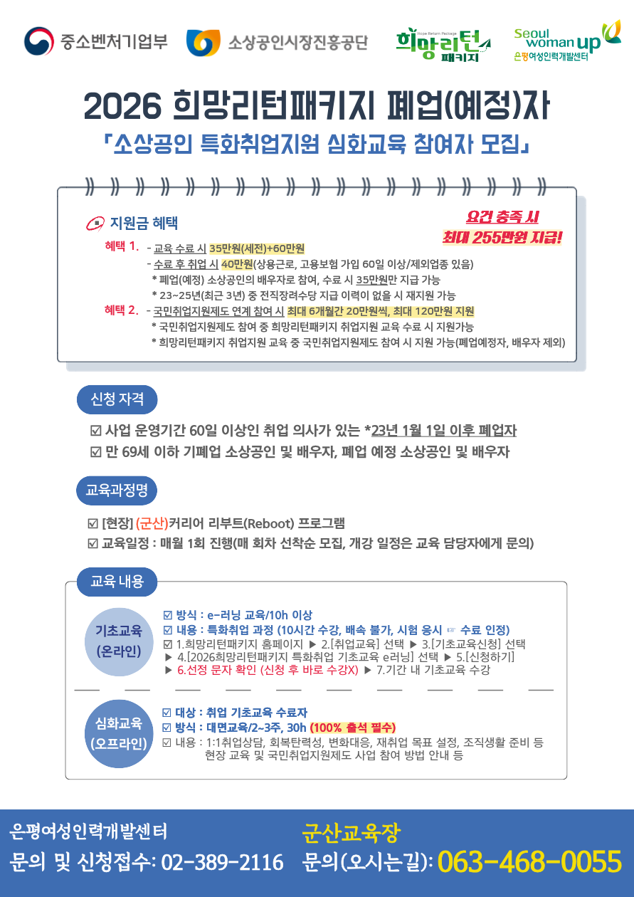 폐업(예정)자의 재취업을 위한 2026년 희망리턴패키지 사업 참여기회를 놓치지 마세요!