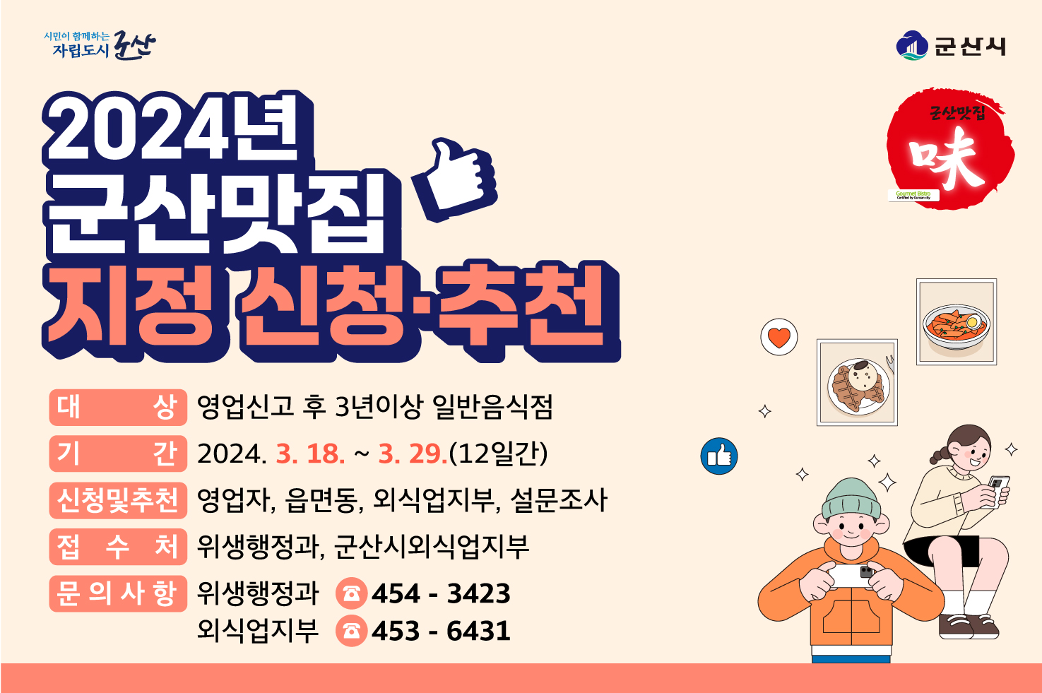 2024년 우리시를 대표하는「군산맛집」을 신규 지정하고자 하오니, 관내 음식의 맛 등이 우수한 업소를 추천 해주세요