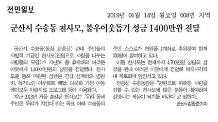 군산시 수송동(동장 전종신)은 관내 주민들의 자발적 기금인 천・사・모(천원으로 사랑을 나누는 사람들의 모임)의 2018년 사업결산 결과, 지난해 총 43세대의 어려운 이웃에게 14,098천원의 성금이 전달됐다고 밝혔다.