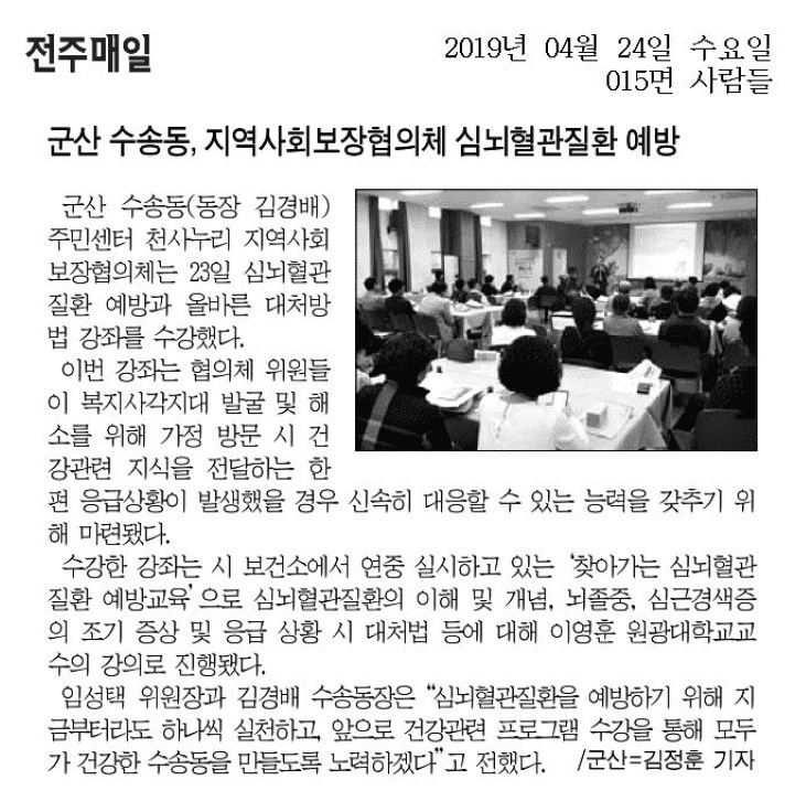 지난 23일, 군산시 수송동 천사누리 지역사회보장협의체(공동위원장 김경배, 임성택) 는, “심뇌혈관질환 예방과 올바른 대처방법”강좌를 수강하였다.