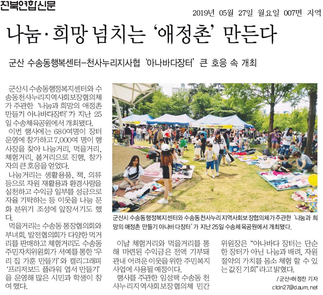 지난 25일, 군산시 수송체육공원에서는 수송동행정복지센터(동장 김경배)와 수송동천사누리지역사회보장협의체(위원장 임성택)가 주관한 『나눔과 희망의 애정촌 만들기 아나바다장터』가 개최되었다.