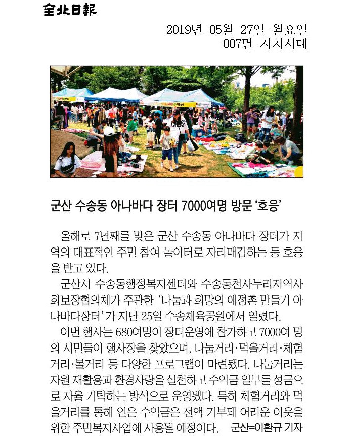 한편, 수송동 아나바다 장터는 2013년 처음 시작하여 올해로 7년째를 맞이하고 있으며 자원과 환경을 생각하고 이웃이 이웃을 돕는 가치를 공유하는 군산의 대표적인 주민 참여 놀이터로 자리매김 하고 있다.