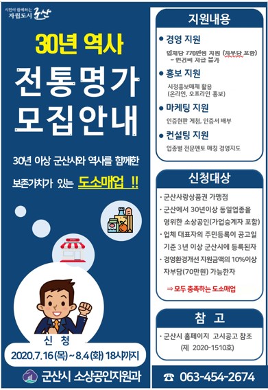30년 이상 군산시 역사와 함께 한 보존가치가 있는 「군산 전통명가」 발굴로 맞춤형 홍보 마케팅과 경영개선 지원 등을 통해 지속 가능성을 높일 수 있는 추가성장 환경을 조성 하고자 하오니, 「군산 전통명가」 사업의 적극적인 참여와 관심 부탁드립니다.