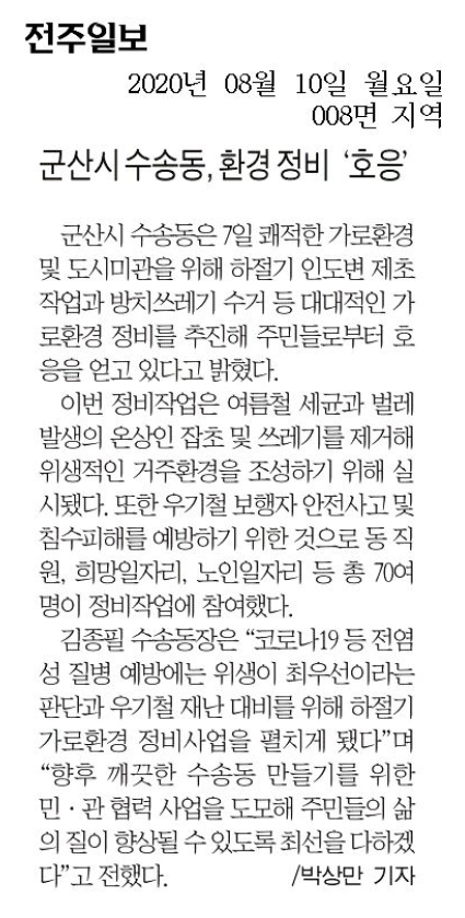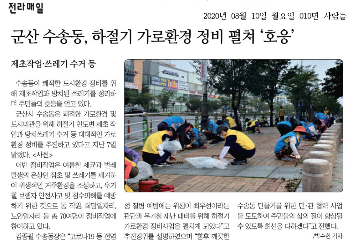 김종필 수송동장은 “코로나19 등 전염성 질병 예방에는 위생이 최우선이라는 판단과 우기철 재난 대비를 위해 하절기 가로환경 정비사업을 펼치게 되었다”고 추진경위를 설명하였으며 “향후 깨끗한 수송동 만들기를 위한 민·관 협력 사업을 도모하여 주민들의 삶의 질이 향상될 수 있도록 최선을 다하겠다”고 전했다.