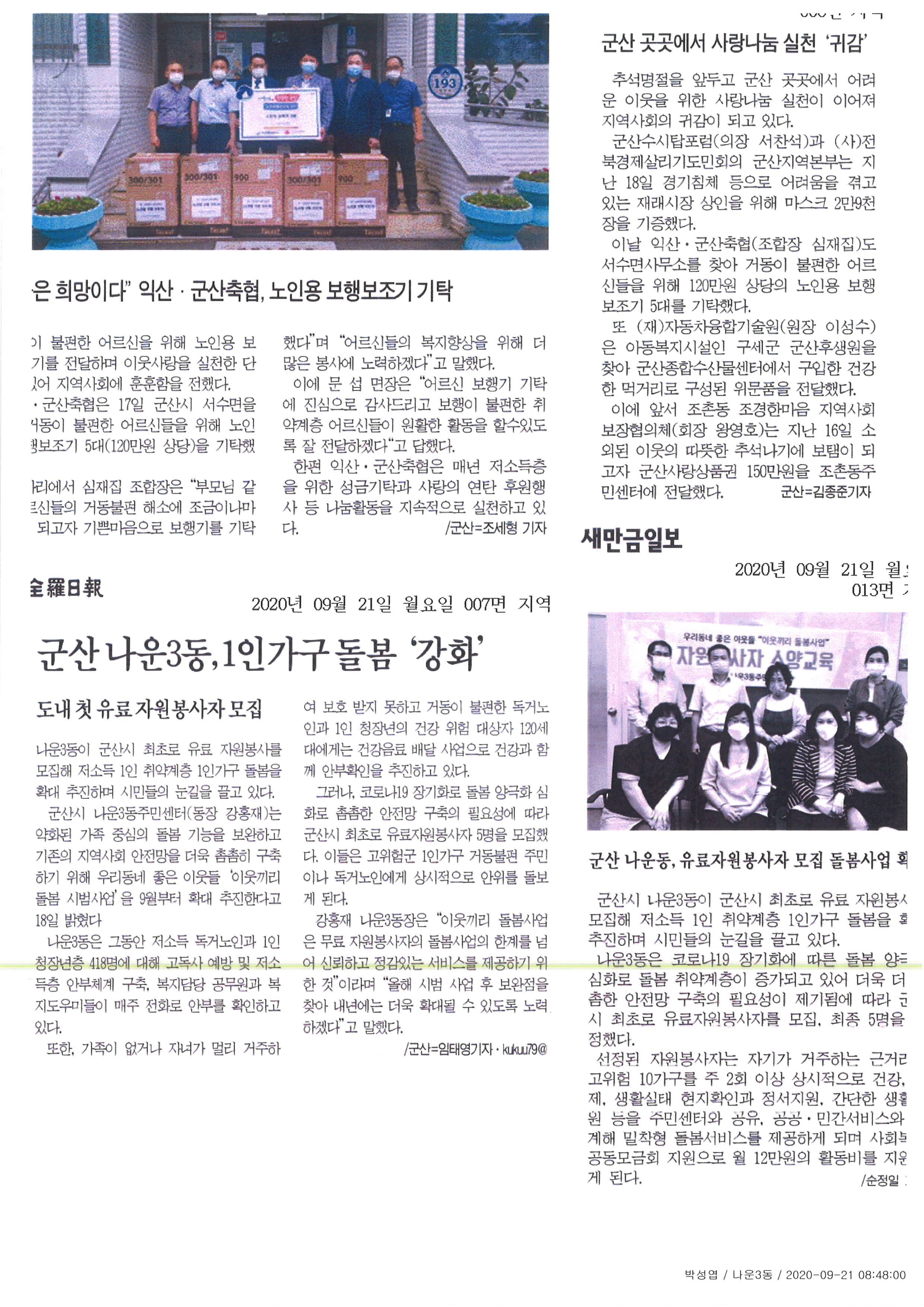 군산시 나운3동이 지역내 최초로 유로 자원봉사를 모집해 저소득 취약계층 1인가구 돌봄을 확대 추진하였습니다