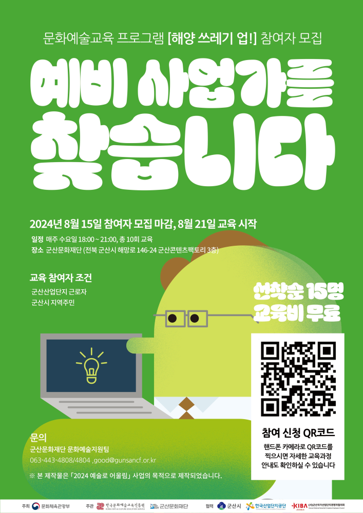 | 707 | (재)군산문화재단 '바닷가 쓰레기 활용 <해양 쓰레기업>' 참여자 추가 모집 안내 |