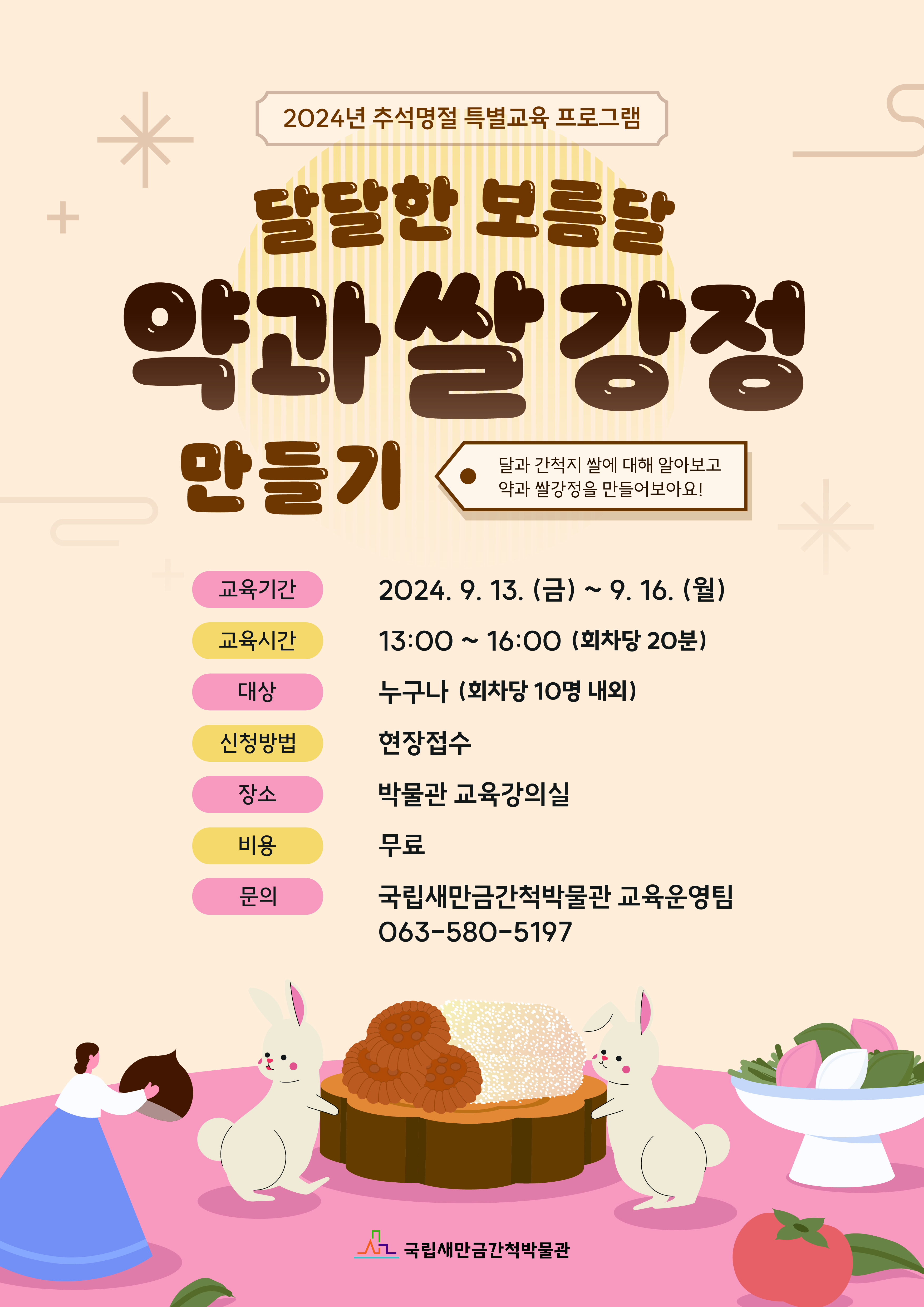 | 709 | 국립새만금간척박물관 추석명절 특별교육 프로그램 <달달한 보름달, 약과 쌀강정 만들기>안내 |