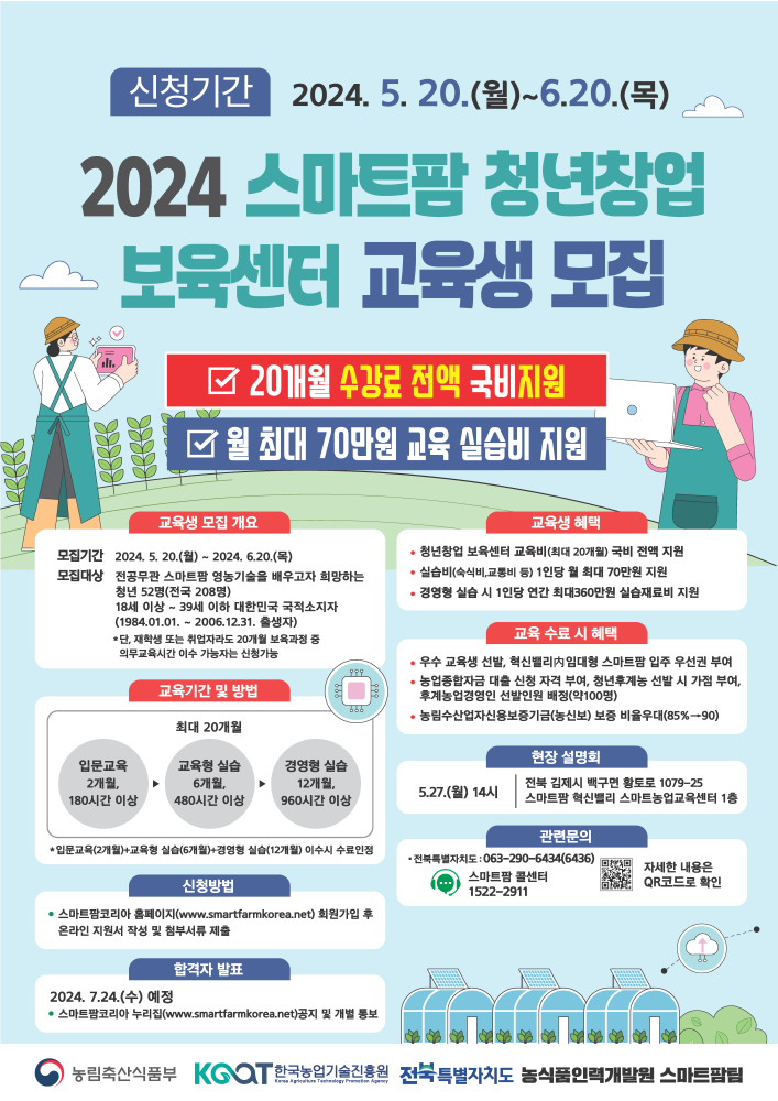 | 684 | [농식품인력개발원] 2024 스마트팜 청년창업 보육센터 교육생 모집 |
