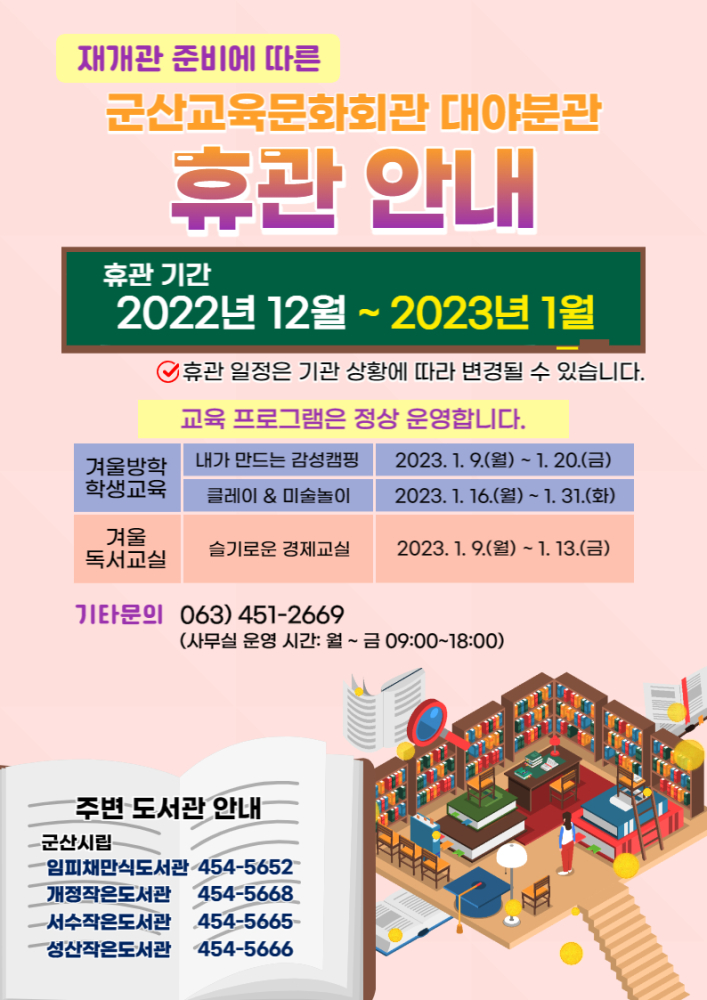 | 535 | 군산교육문화회관 대야분관 2023년도 겨울 독서교실 수강생 모집 안내 |