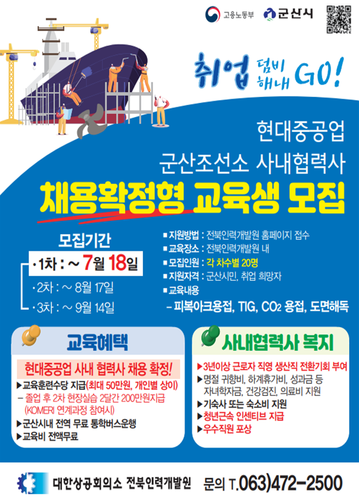 | 475 | 현대중 군산조선소 사내협력사채용확정형 교육생 모집(용접분야-전북인력개발원) |