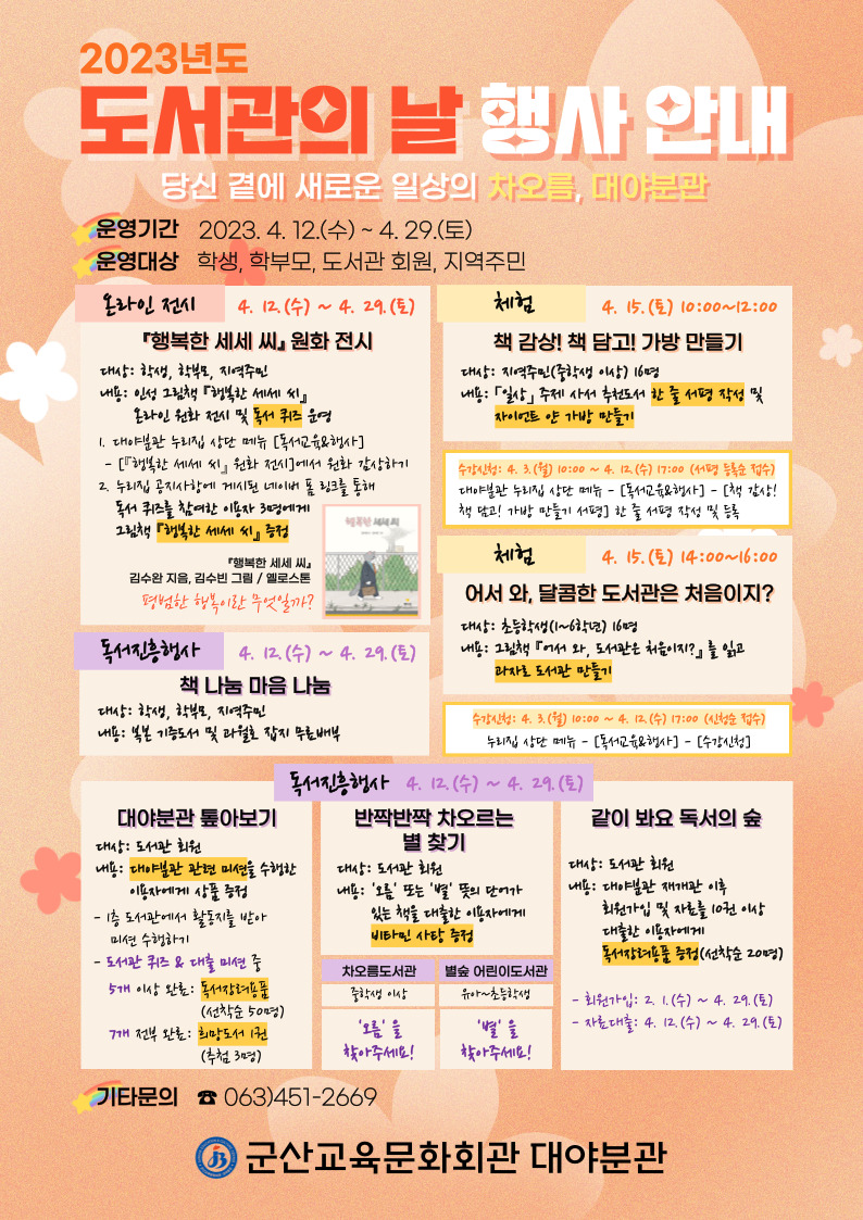 군산교육문화회관 대야분관에서는 2023년 도서관의 날 및 대야분관 재개관을 기념하여