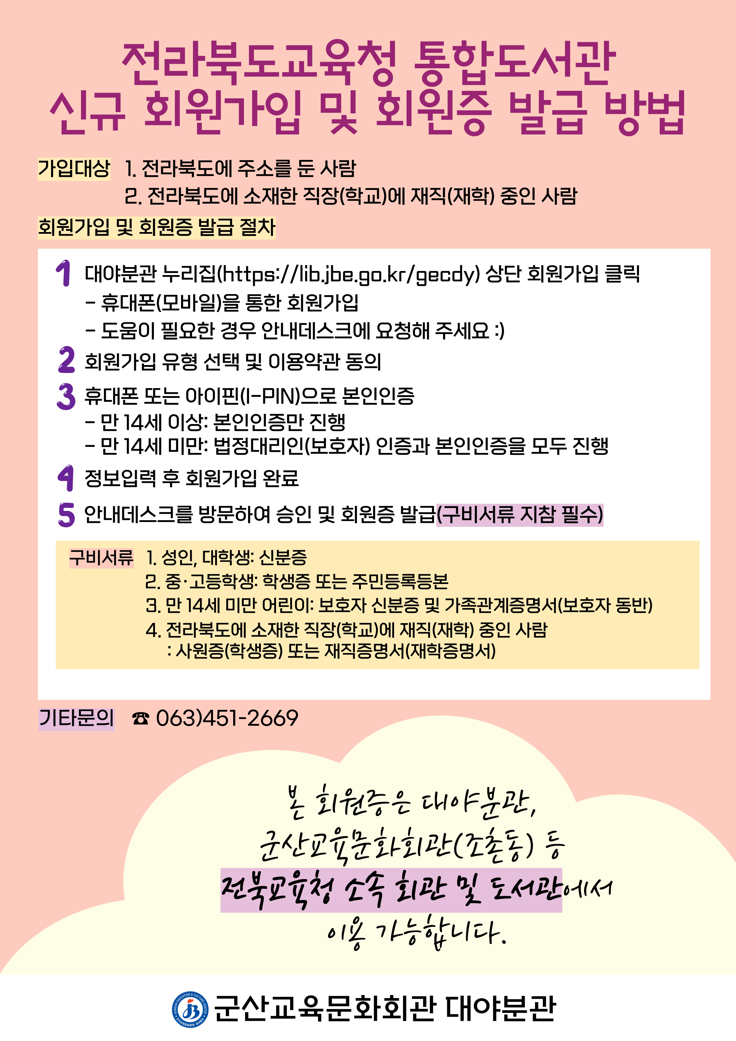 ○ 기타문의: 군산교육문화회관 대야분관 ☎ 063)451-2669 (누리집:https://lib.jbe.go.kr/gecdy)