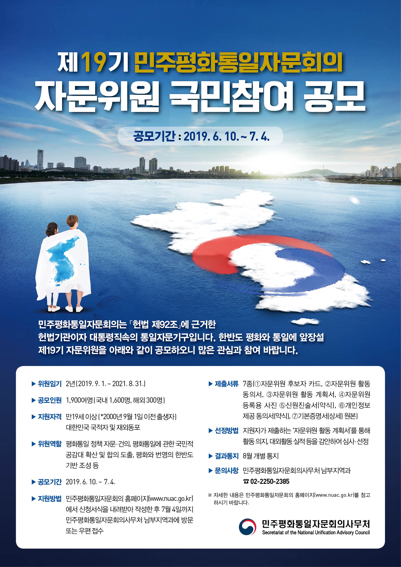 한반도 평화와 통일에 앞장설 제19기 자문위원을 아래와 같이 공모하오니 많은 관심과 참여 바랍니다.