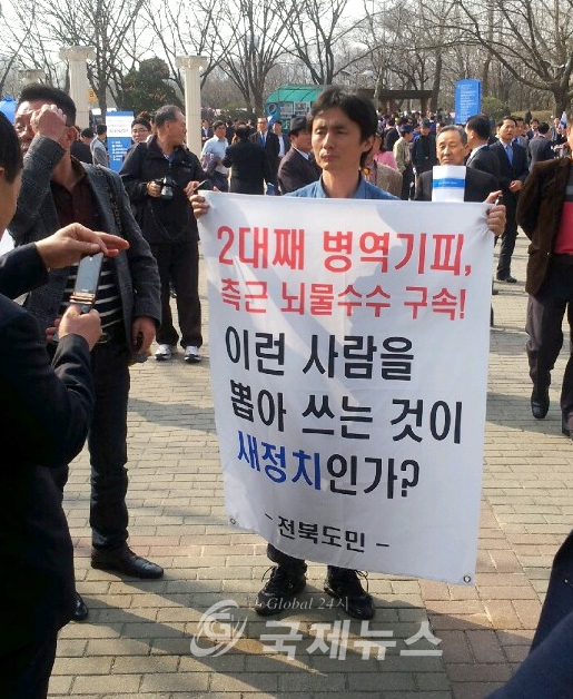 박 모(42)씨가 목에 건 피켓에는 '2대째 병역기피 측근 뇌물수수 구속, 이런 사람을 뽑아