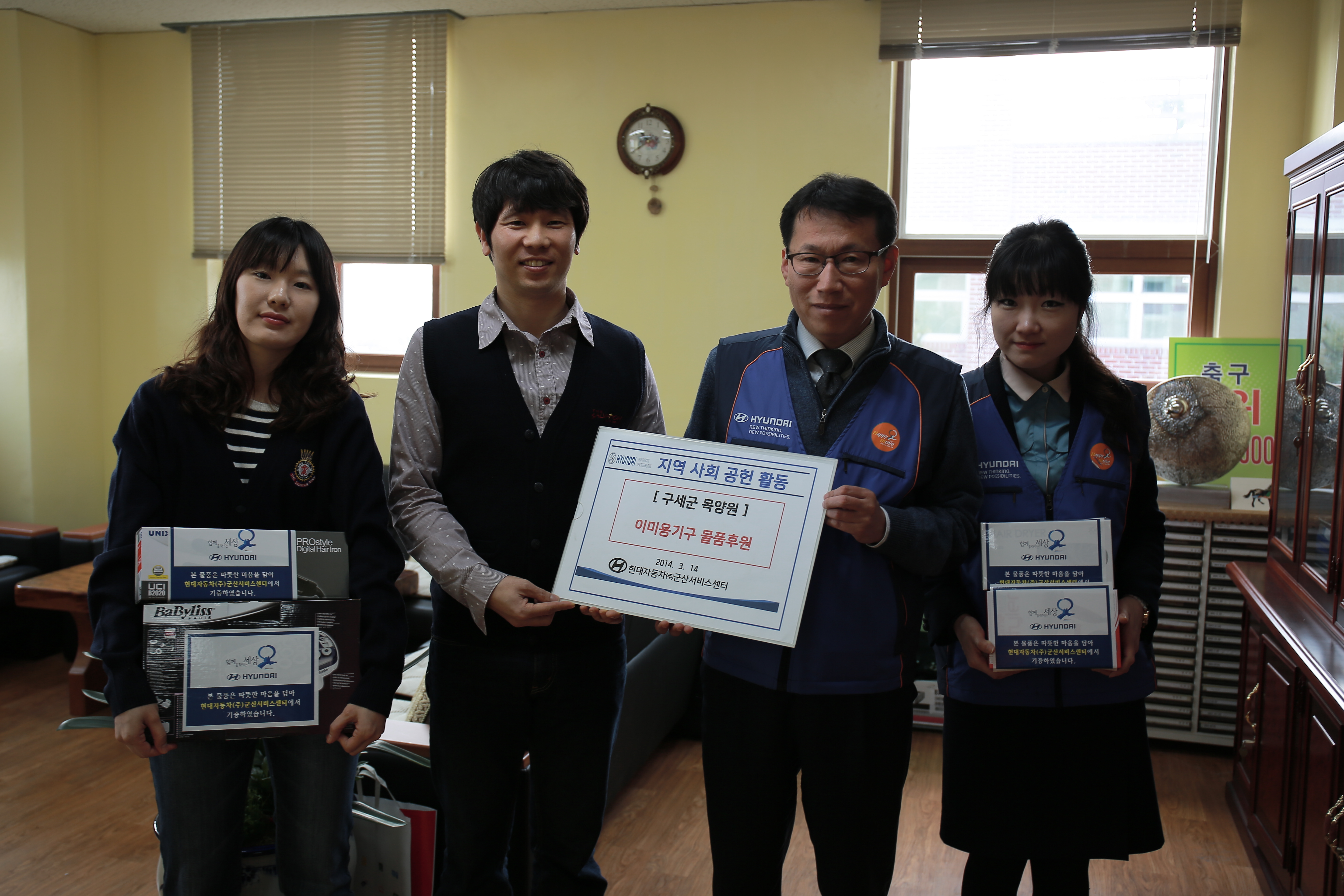 현대자동차 군산서비스센터(김채주 센터장)는 ‘자동차를 통한 인류의 행복추구’ 라는 경영 이념을 바탕으로 ‘함께 움직이는 세상’이라는 사회공헌 사명을 군산지역 시민들에게 실천하기 위해 그간 임직원들의 자발적인 참여와 서비스센터를 운영하며 얻어진 수익의 일부를 바탕으로 사회공헌 기금을 조성하였고 매해 군산지역 내 소외계층의 주거환경 개선, 물품 후원 등 사회복지실천에 필요한 자원을 제공하는 나눔 활동을 펼치고 있다.