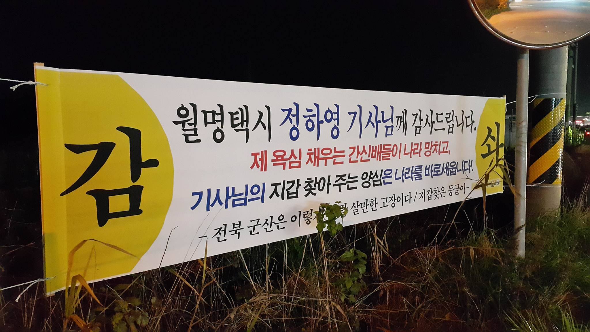 금요일에 데모용품 사려고 빨빨거리고 다니다가 택시에 떨어트렸던 지갑을 영영 잃어버린 줄 알았는데, 다시 찾았다. 월명택시 정하영 기사님께 약소하게라도 사례를 하려고 했는데, 안받는다는 거다. 그래서 회사 찾아가서 음료수 전해드리고 방금전에 회사 앞 도로에 현수막 하나 걸었다.