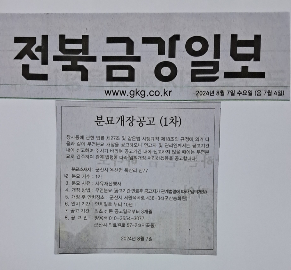 | 275 | 분묘개장공고(1차)-군산시 개정동 | 가나묘지이장공사 | 24.07.11 | 945 | |