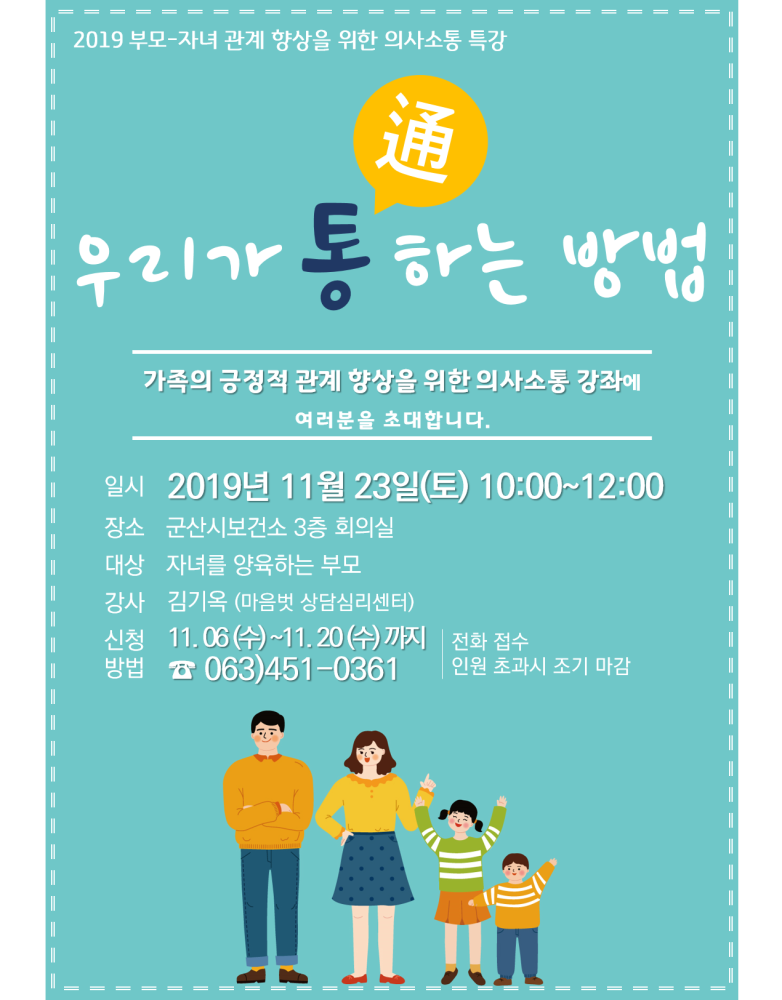 96 2019 부모-자녀관계 향상을 위한 의사소통 특강 [우리가 통하는 방법] 안내 다운받기 건강관리과 19.11.05 4832