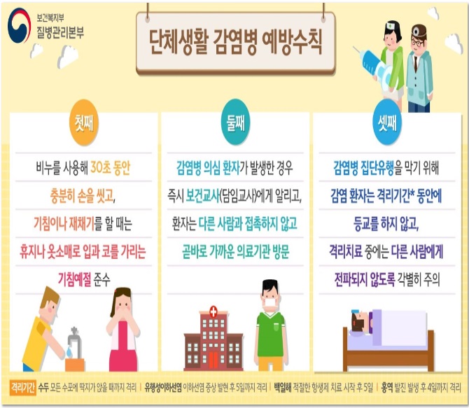 1. 신학기 대비 봄철 유행하는 감염병의 집단 발생 예방을 위하여 예방접종 완료, 올바른 손 씻기와 기침 예절 등 개인위생수칙 준수, 환기, 감염병 의심 증상이 나타나면 가까운 의료기관에서 적절한 진료와 검사를 받기 등 단체생활을 위한 감염병 예방수칙을 준수해주시기 바랍니다.