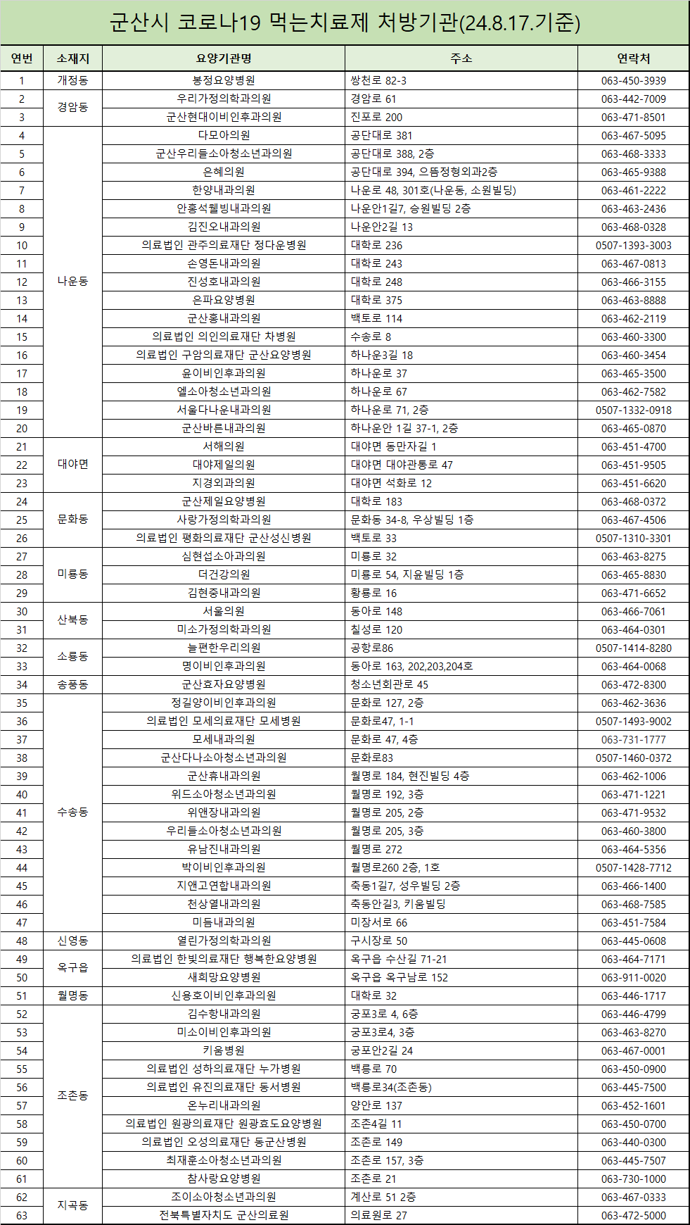 24. 8. 17. 기준, 군산시 코로나19 먹는치료제 처방기관 안내드립니다.
