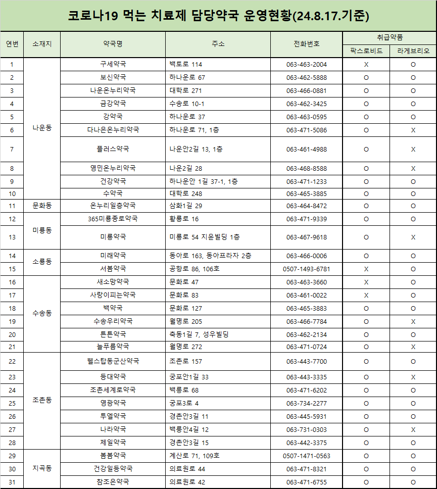 군산시 코로나19 먹는치료제 담당약국 운영 현황 안내드립니다.