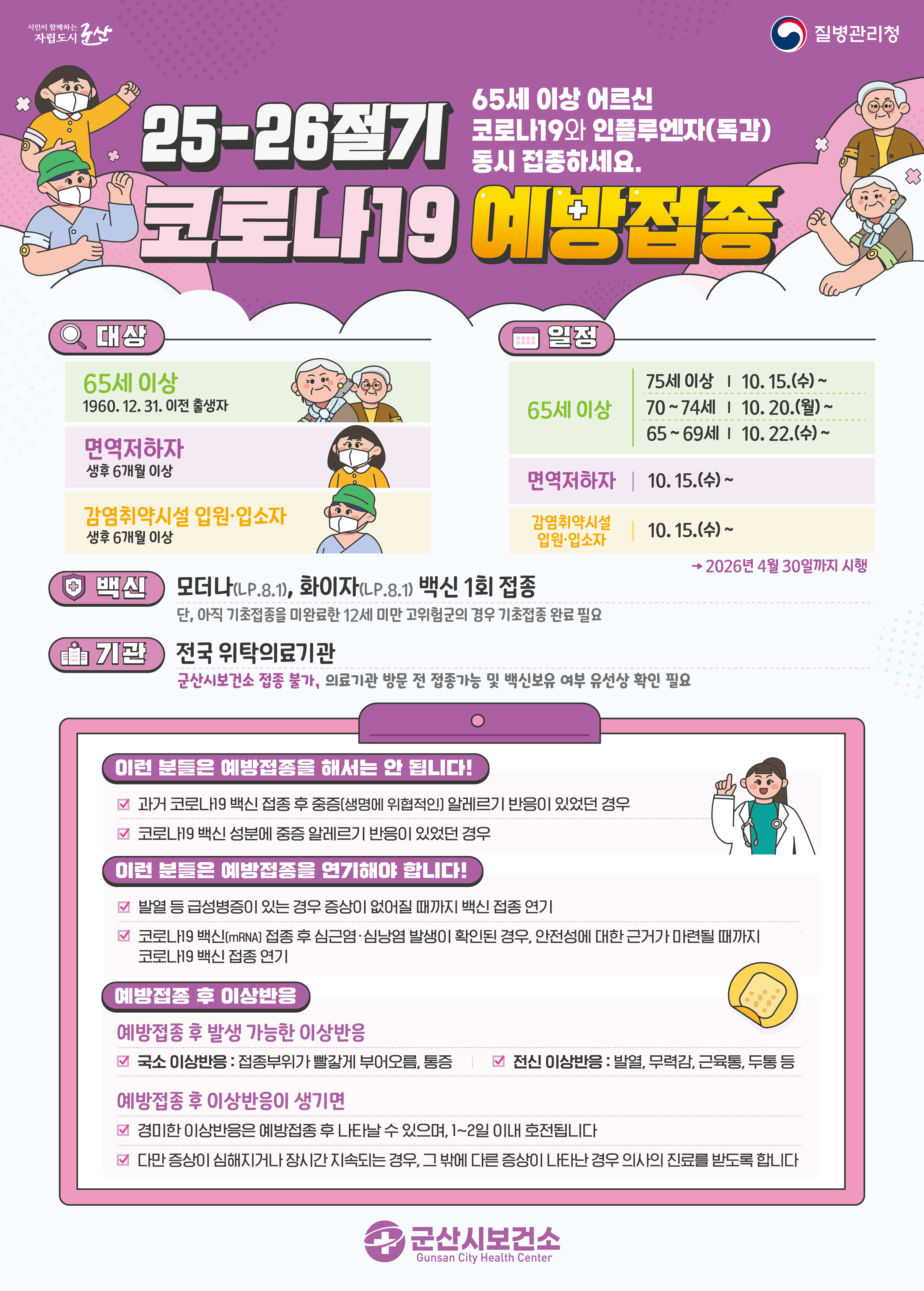 2025-2026절기 코로나19 및 인플루엔자(독감) 예방접종 일정을 다음과 같이 안내합니다.