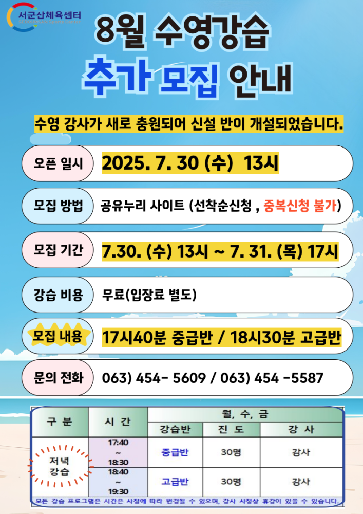 212 서군산체육센터 수영강습모집안내 (매월 동일) 다운받기 체육진흥과 25.08.06 417
