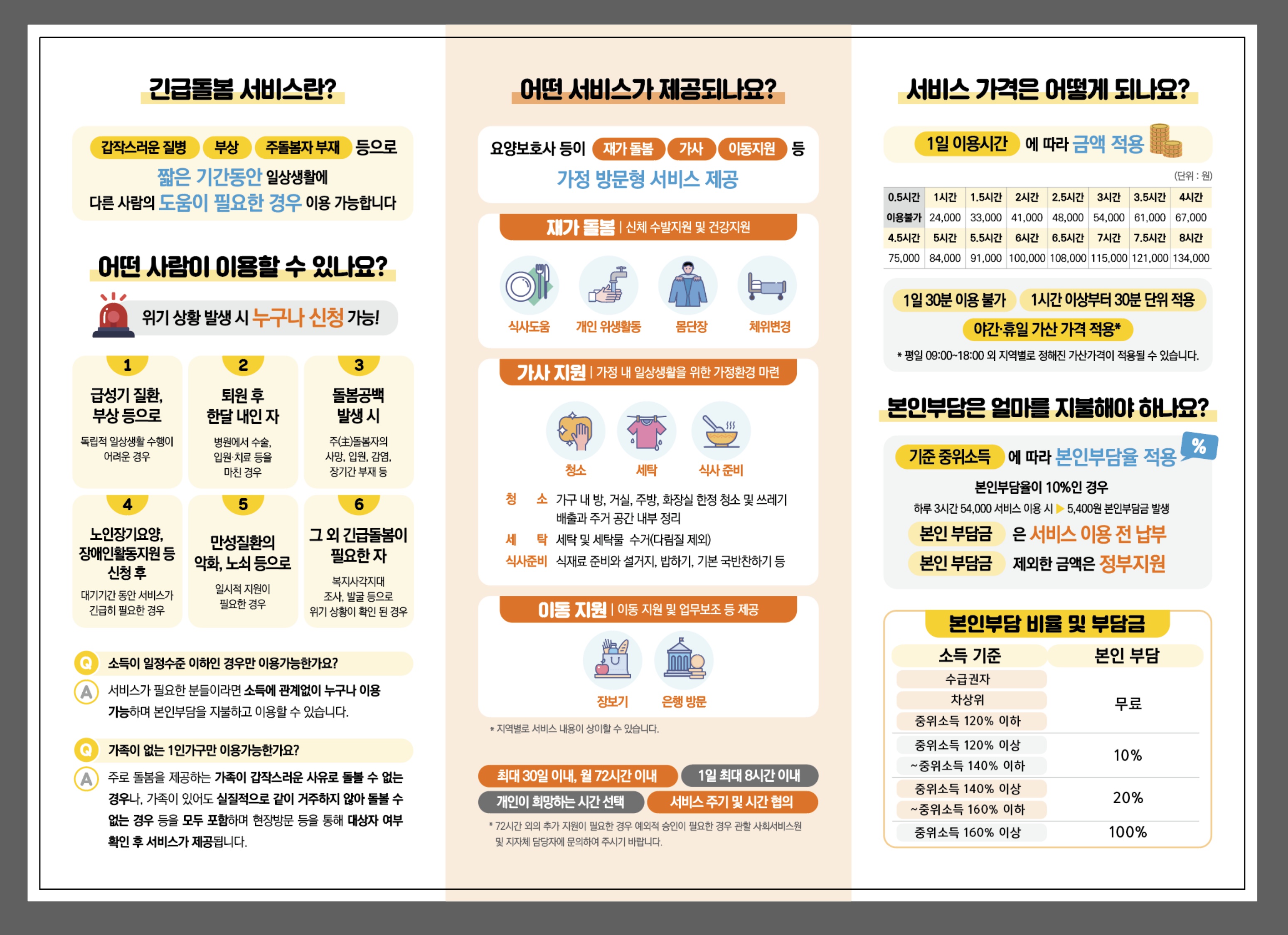 <주요 위기사항> ▸급성기 질환 및 부상 등으로 독립적 일상생활 수행이 어려운 경우 ▸병원에서 수술, 입원치료 등을 마치고 퇴원 후 1달 내인 자 중 필요한 경우 ▸주(主)돌봄자의 사망, 입원, 가출, 행방불명 등으로 돌봄공백 발생 시 ▸노인장기요양, 장애인활동지원 등 기존 서비스 신청 후 대상자 선정까지의 대기기간 동안 서비스가 긴급히 필요한 경우 등 ▸타 공적 서비스를 신청하지는 않았으나 만성질환의 악화, 노쇠 등의 급격한 진행으로 일시적 지원이 필요한 경우 ▸복지사각지대 조사, 발굴을 거쳐 긴급돌봄이 필요한 것으로 확인된 경우 등 |