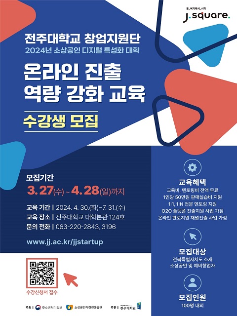 | 25 | 2024년 소상공인 디지털 특성화 대학(전주대학교 창업지원단) 교육생 모집 홍보 | 추진완료 |