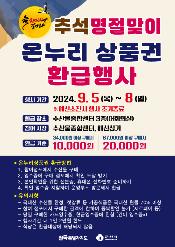 8 [전북도·군산시] 자체 추석맞이 수산물 온누리상품권 환급행사 추진! 다운받기 수산식품정책과 24.08.29 2250