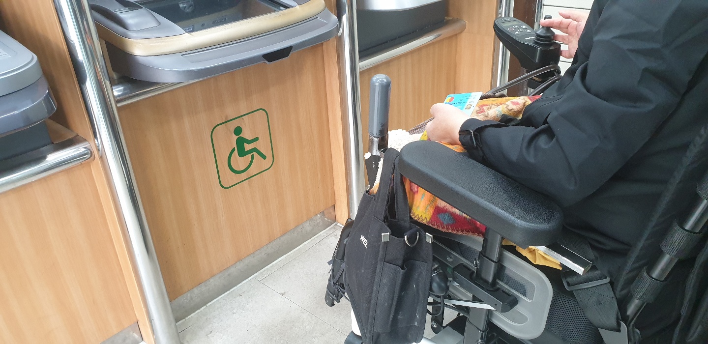 휠체어 앞부분이 들어갈 수 있는 공간 확보와 버튼의 높이와 거리 조절등은