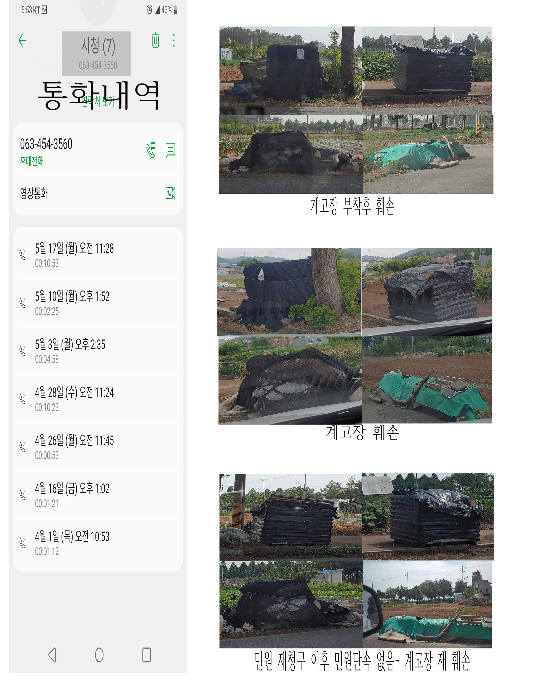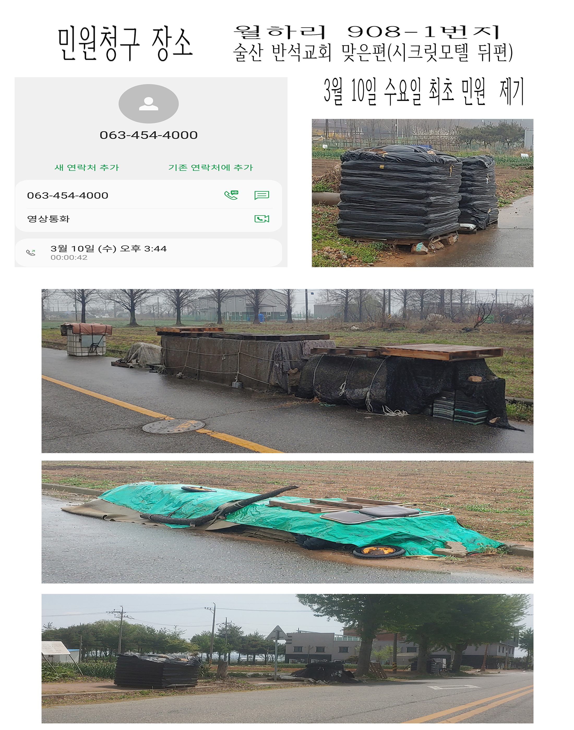 위 상술상황이 지속되어 4월 1일 . 16일 , 26일 , 28일 5월 3일 10일 17일 에 걸쳐서 민원을 재 청구함