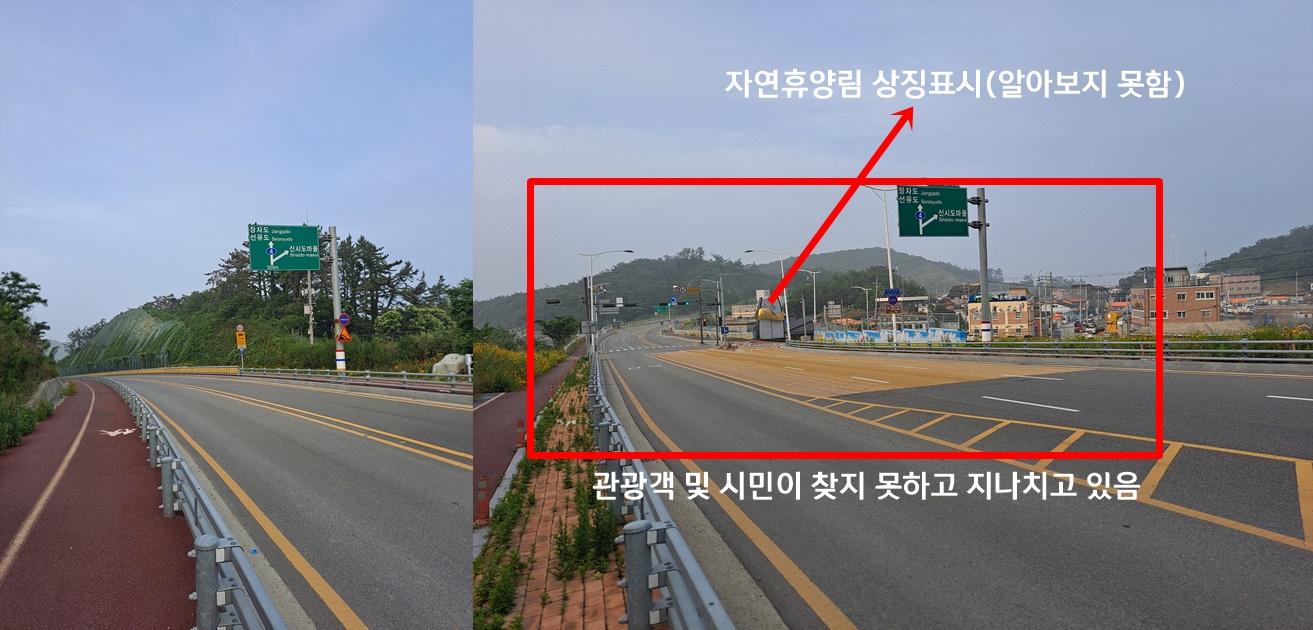 최근에 오픈한 국립 신시도자연휴양림에 많은 관광객과 군산시민이 찾아오고 있으나 도로표지판이 현재상태와 틀리며