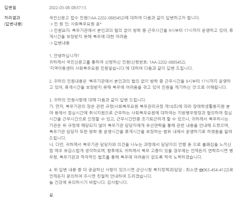 그 후로 병무청 주무관님께서 저에게 전화가 와서 문제를 말씀드리고 주무관님께서 따로 본청에 문의를 하셔서 근무시간 조정은 합의가 필요하고 기관장 재량으로 할수있는 것은 따로