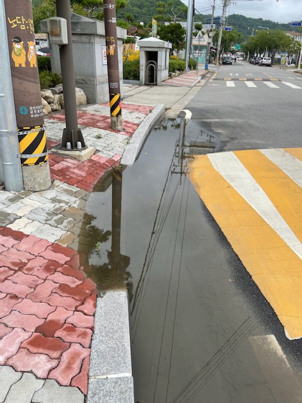 학교 정문 앞 도로에 물이 고여있어