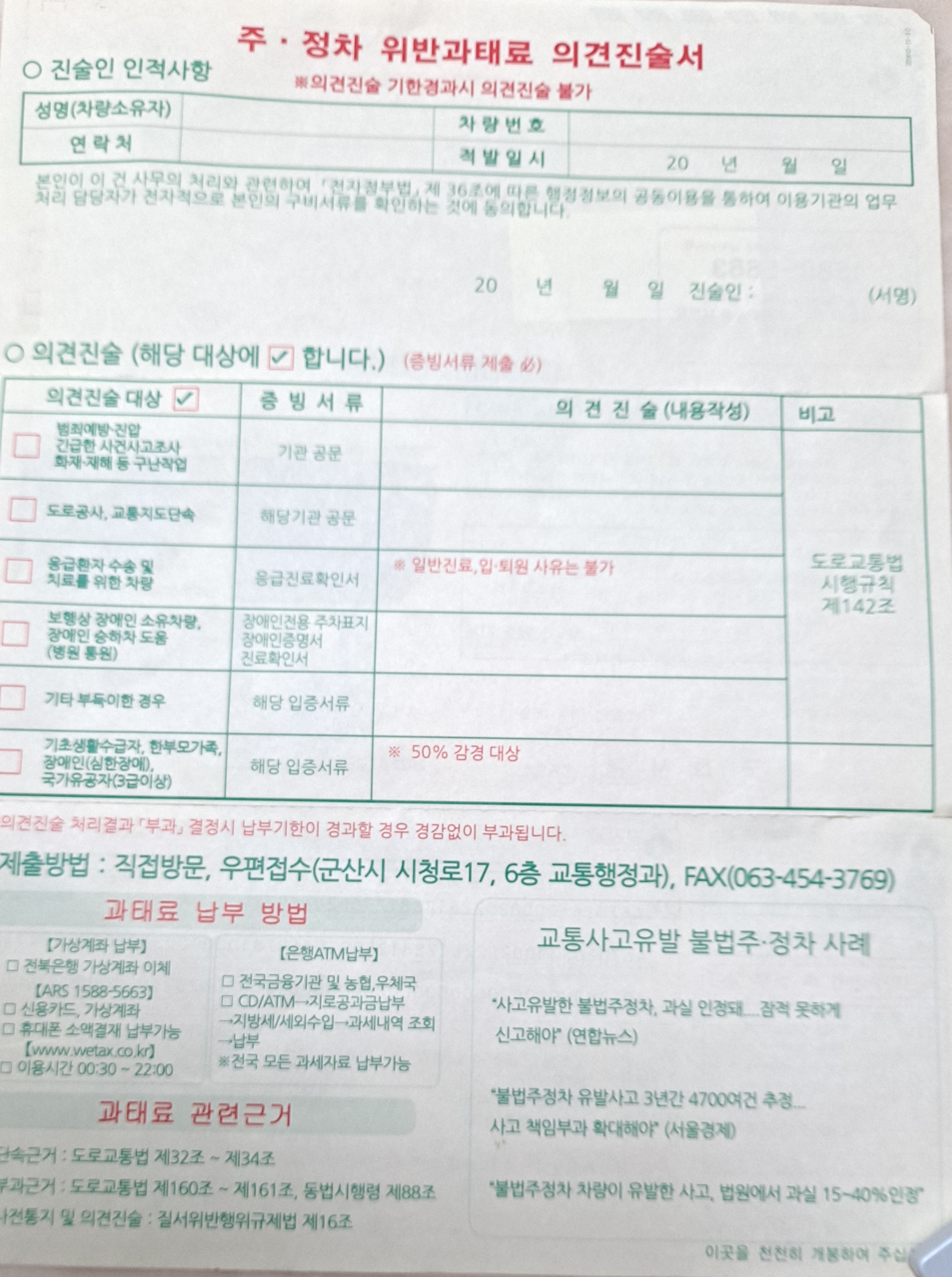본인의 부득이한 사항(일시적인 장애로 준법 준수 장해와 굳이 단속하지 않아도 되는 사항)이 통지서 뒷면
