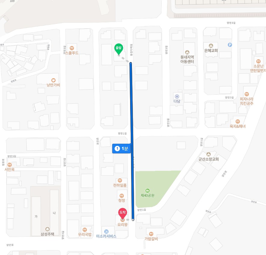 아래 보이는 경로(파란색 선)의 가로등이 매우 어두워서
