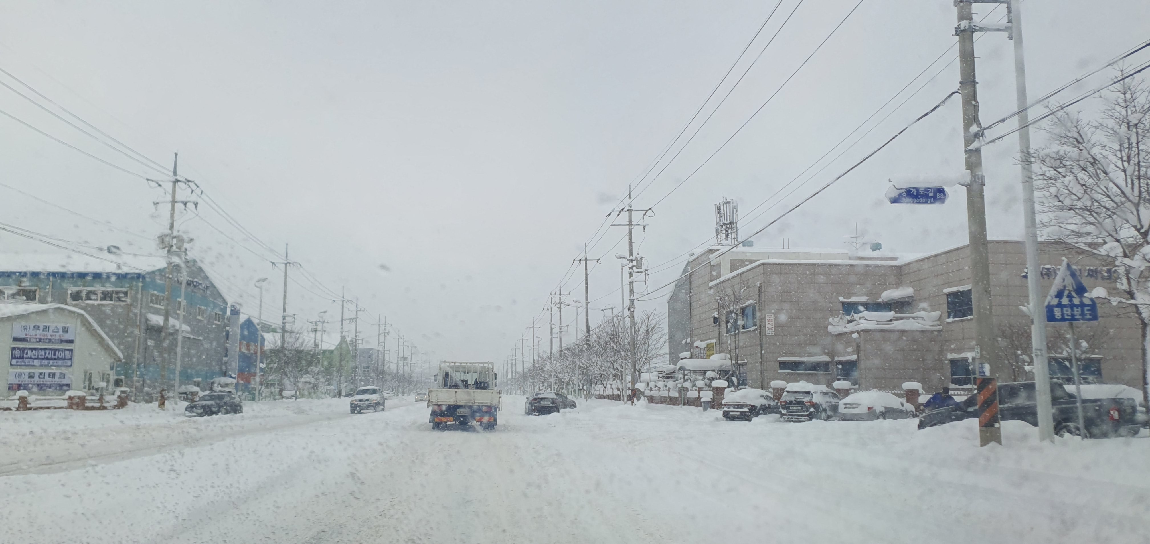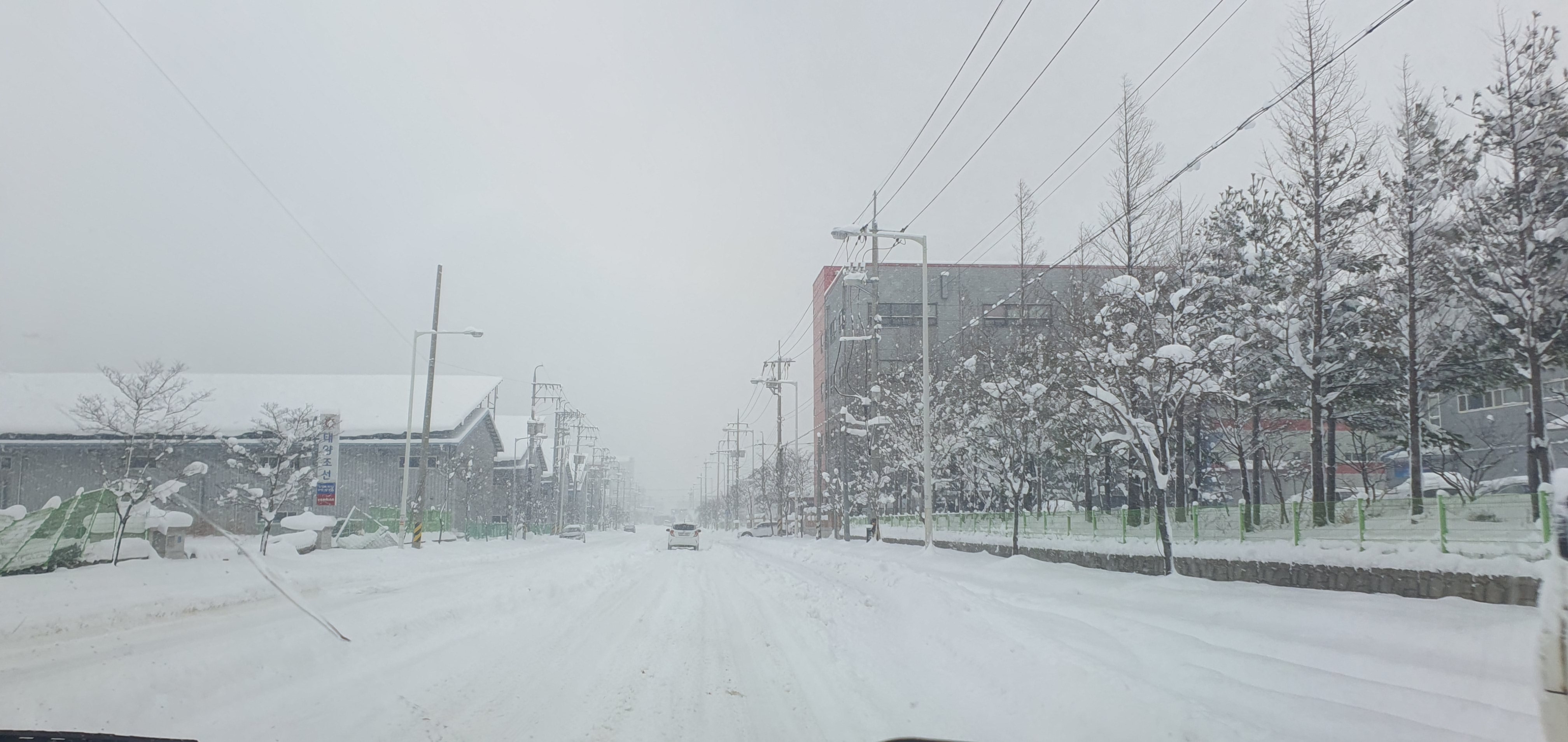제설이 하나도 되지 않아 눈에 많이 미끄러워하는 차들이 많은 것을 볼 수 있어요..